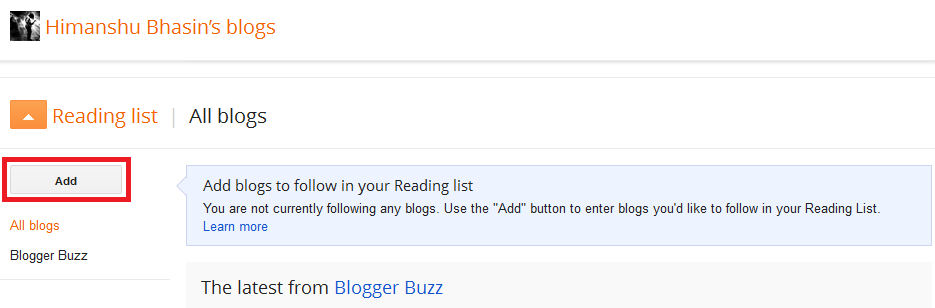 Step 1: Below to your Blogger Dashboard, you can see Reading List. Click on Add button to Add blog(s) on your reading list.Step 2: Enter Blog url your want to follow or you can follow multiple blogs at once using +Add link to Add more than one blog url.